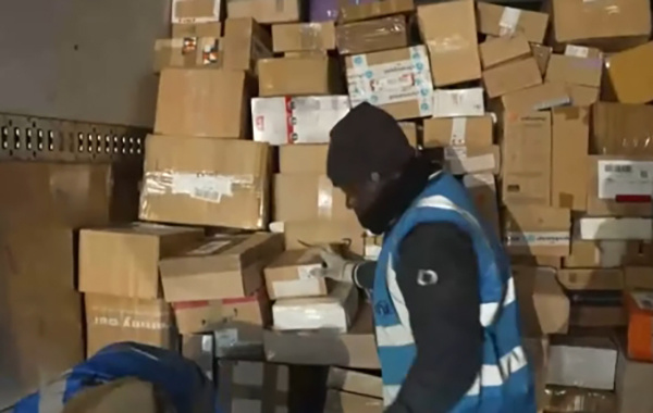 法国工人将包裹装车。 视频截图
